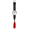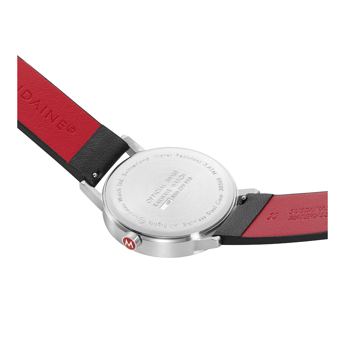 Su forma sencilla, su caja de acero mate de 40mm de diámetro, el cristal de mineral endurecido y la correa de piel vegana negra con interior rojo hacen de este reloj un verdadero icono del tiempo.
